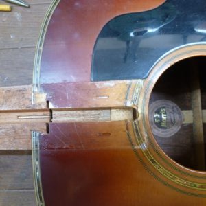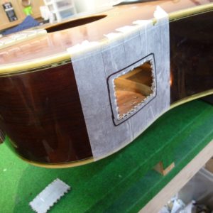指板は剥がす前に元の位置に貼り直せる様、フレットの溝に穴を空けてダボを打てるようにしておきます。