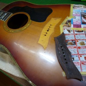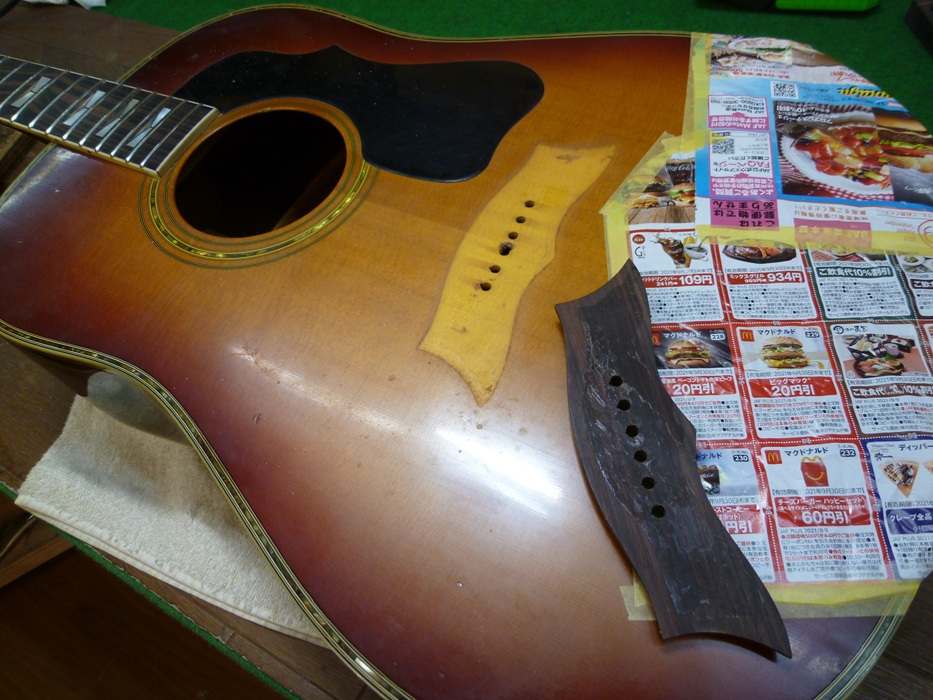 接着剤を塗布しますとそれに含まれる水分のせいで指板が反ってしまうからです。