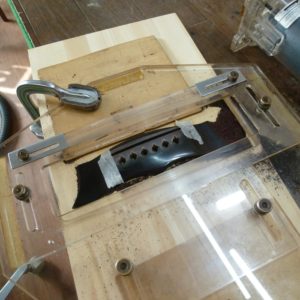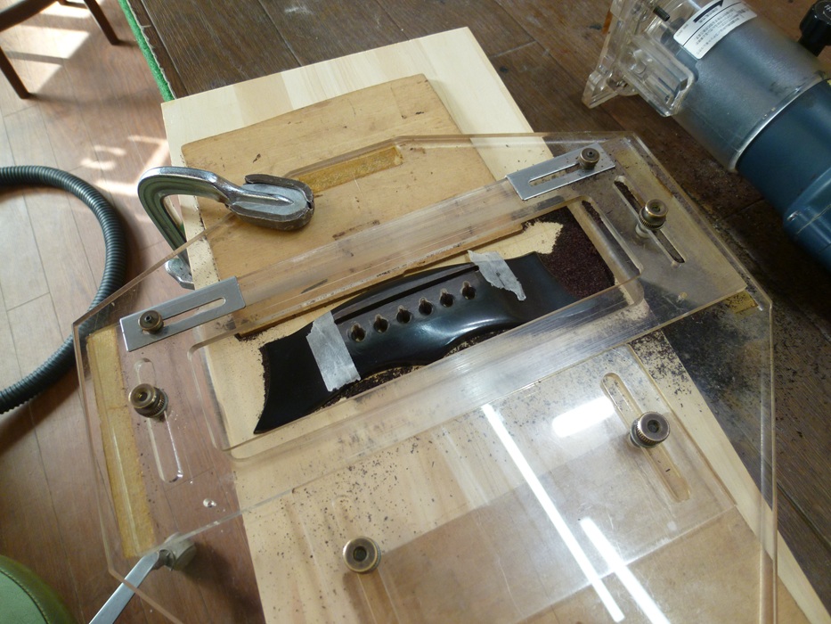 このブリッジにピックアップを仕込むのですが、深さが足りない為、溝を直します。