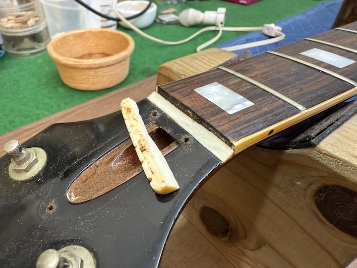 まずは指板を剥がす前にナットを取り外し。