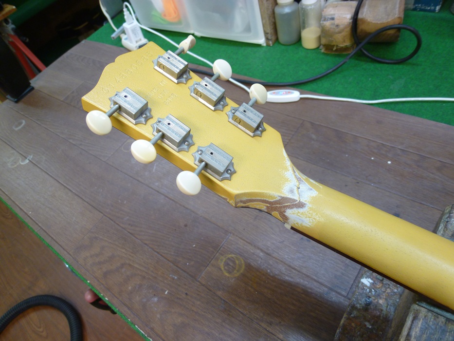 Gibsonの場合は塗装膜が厚めなので、塗装修正無しでも割ときれいに仕上がる場合も多いですが、こちらのつや消しタイプのトップコートは非常に薄い為、整形の際に塗装は剥がれます。