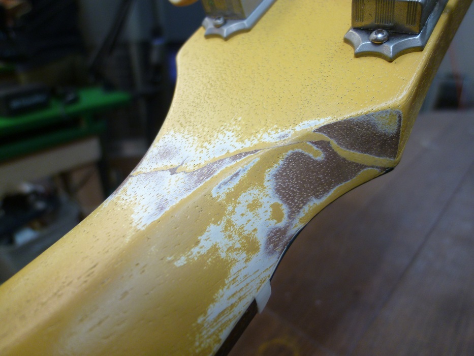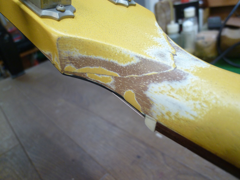 塗装の薄いギターの場合はこのように塗装は剥がれてしまいます。