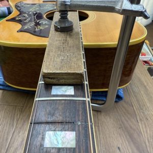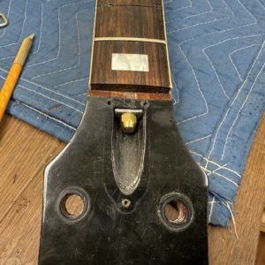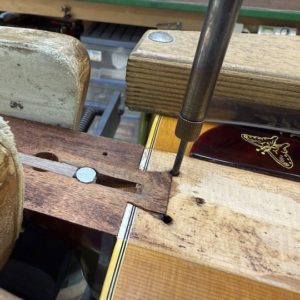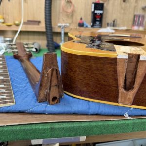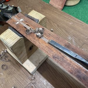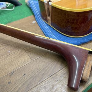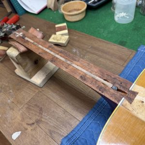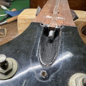 前編のロッド交換の続きですが、今回は主にネックリセット編です。新しいロッドの埋木をある程度ノミで削っていきます。