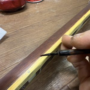 ダボを打っていてもネックと指板の境目は100%ツラが合う訳ではありませんのでサンディングで平らにします。その際に色が禿げる部分がありますのでタッチアップを施します。