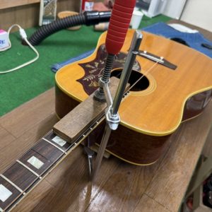 指板が剥がしてある状態ですので、ダブテイルジョイント部を温める用の穴はいつもの指板上から開けるよりも容易です。それもあってロッド交換→ネックリセットはよくある組み合わせなのです。