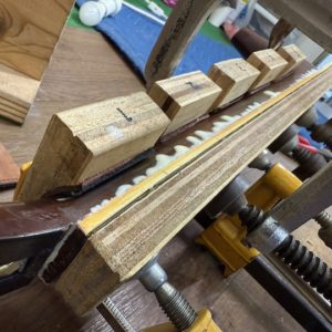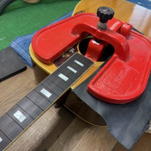 ネックと指板の境目からタイトボンドがウニュウニュと溢れてきます。タイトボンドは後からある程度拭き取れますが、今のうちに綺麗に拭き取りましょう。