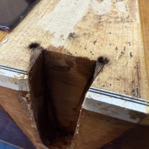 よく見るとダブテイルジョイントの正面とボディとの隙間がなく、ピッタリなので、指板を剥がしていなかったら、穴あけ時にちゃんと狙ったところにあいているか不安になるパターンですね。
